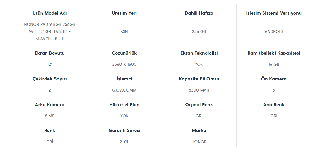 Honor Pad 9 8GB 256GB Wifi 12" Gri Tablet + Bluetooth Klavye